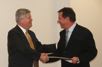 ![]() ATG officers conducted the Annual Shareholders' meeting prior to the Open House. Shown here is Bill Austin, ATG Board Chairman (Effingham, Ill.), congratulating Peter Birnbaum, ATG President (Chicago, Ill.) on his 25 years of service to ATG. |